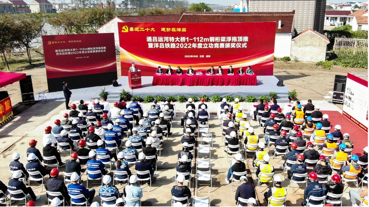 洋呂鐵路舉辦全線(xiàn)首個(gè)112m鋼桁梁浮托頂推暨洋呂鐵路2022年度立功競(jìng)賽頒獎(jiǎng)儀式